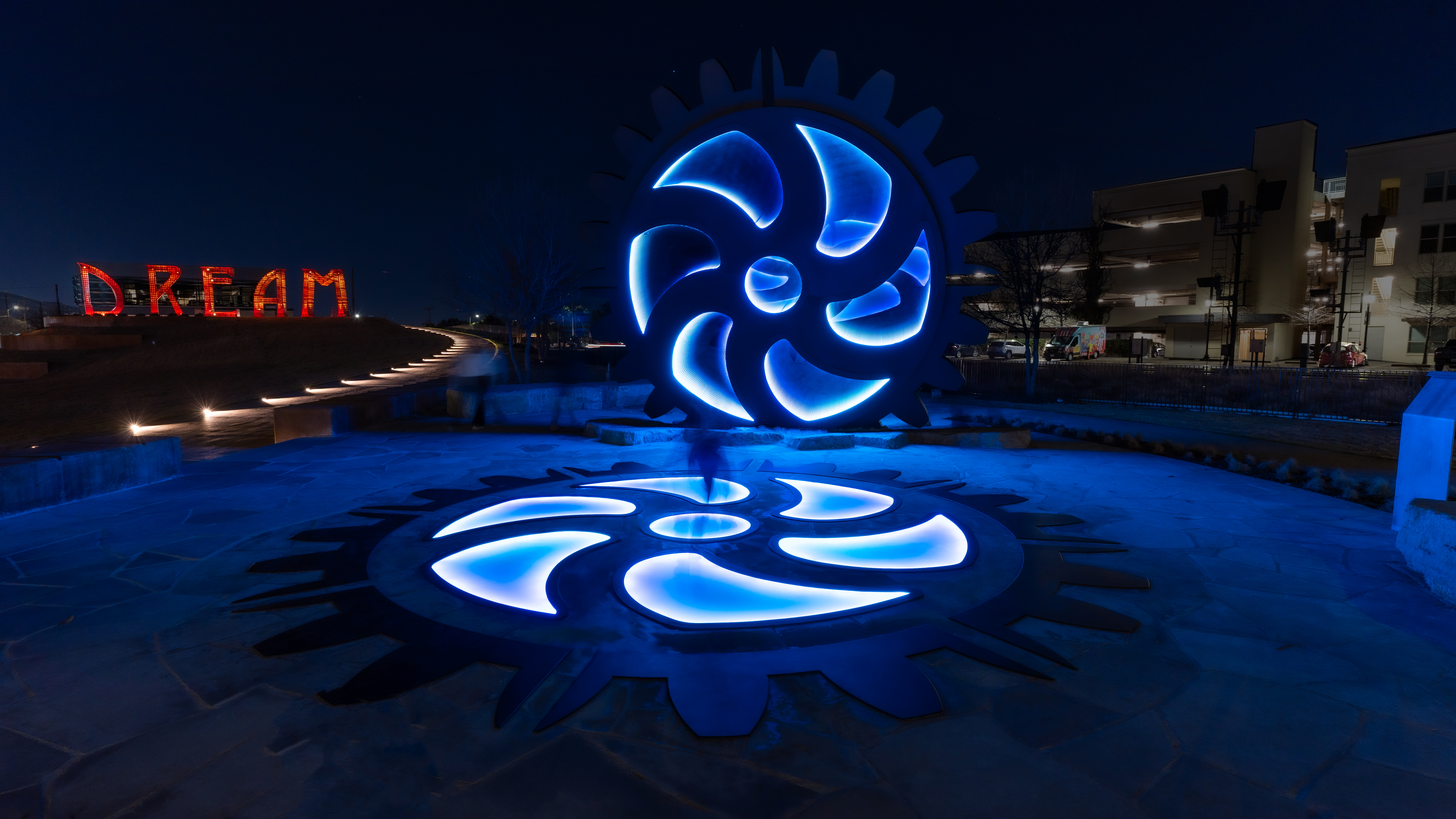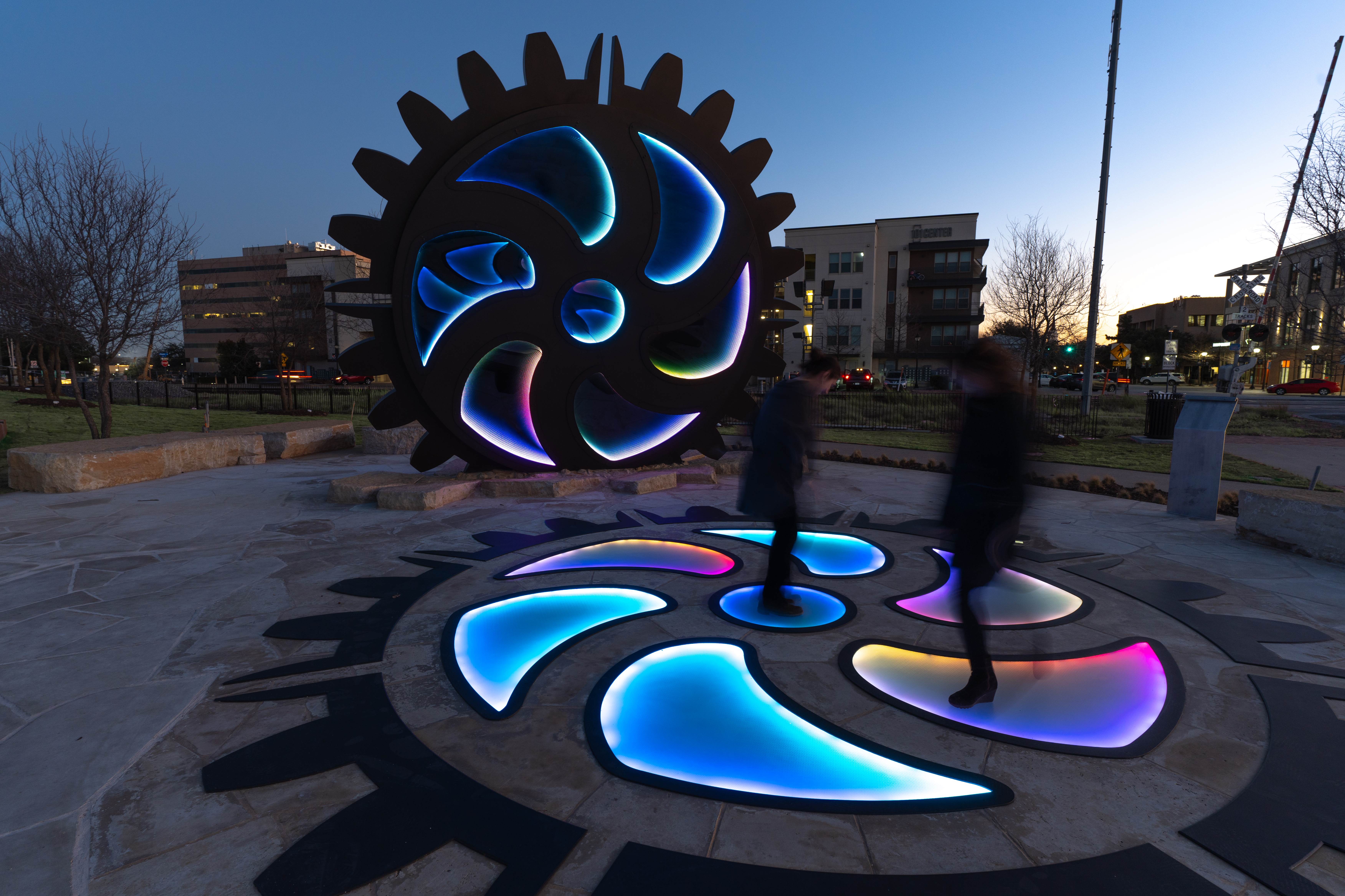 Adjacent to the standing gear is the interactive in-ground gear. This feature comes alive with color and light, responding to the movements of participants as they walk, dance, and interact with its surface. By actively engaging with the sculpture, individuals become integral to its artistic expression, fostering a sense of community and inspiring public involvement.