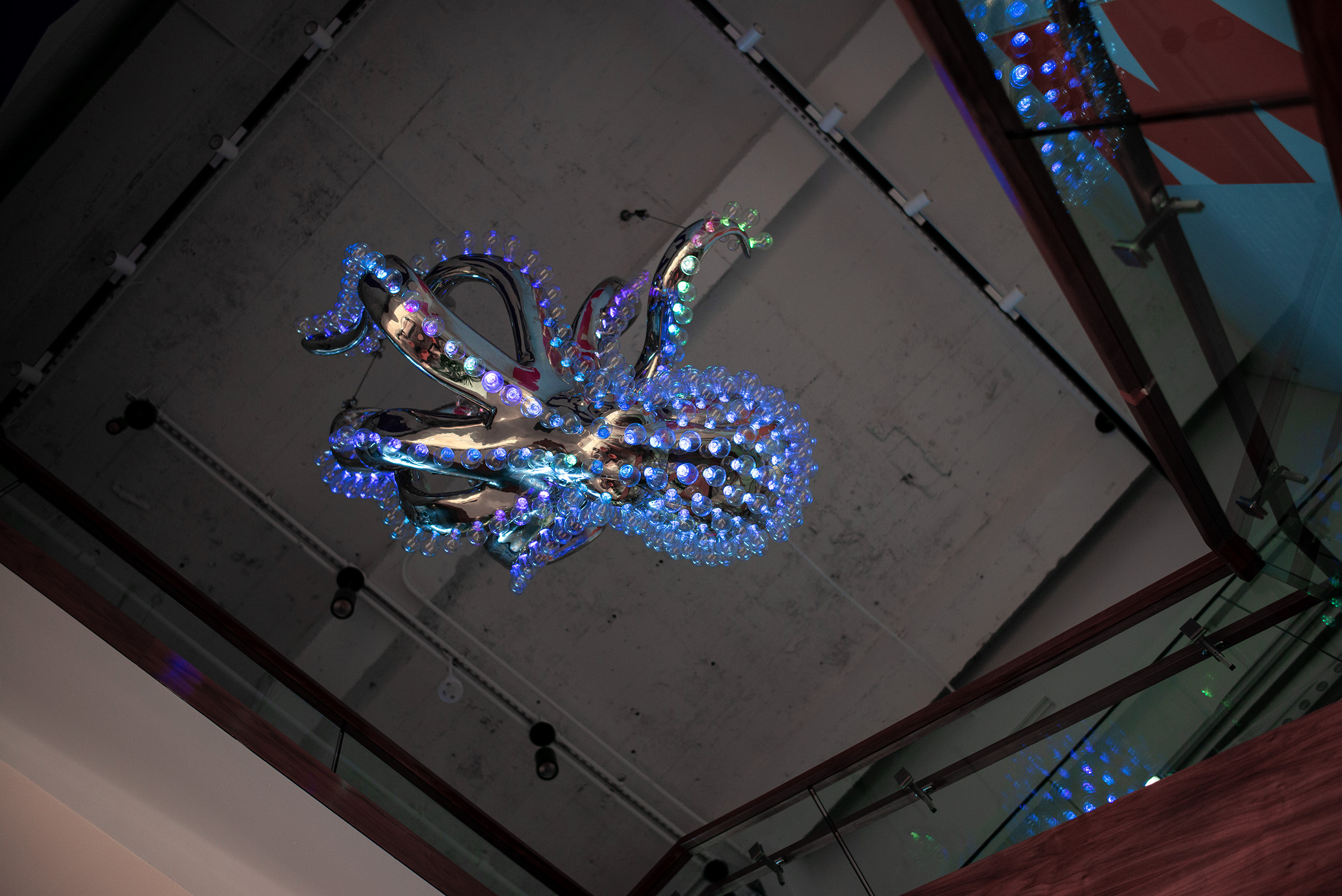 The Edison Octopus is uniquely integrated with the Braze Edison Cloud, commissioned in 2020. Together, the sculptures respond dynamically to user interactions, creating a synchronized experience where their color palettes and lighting effects adapt and evolve in harmony.
