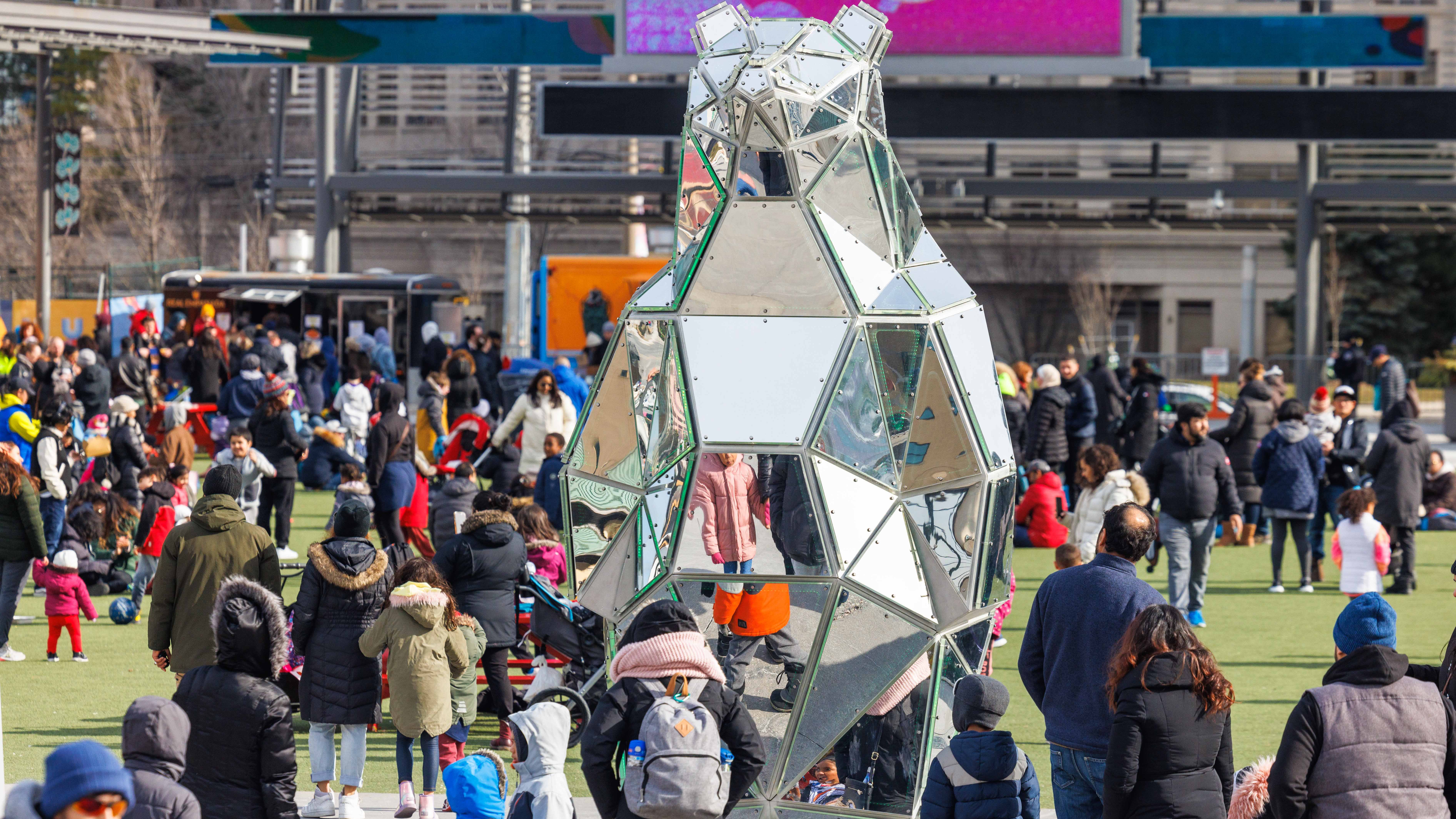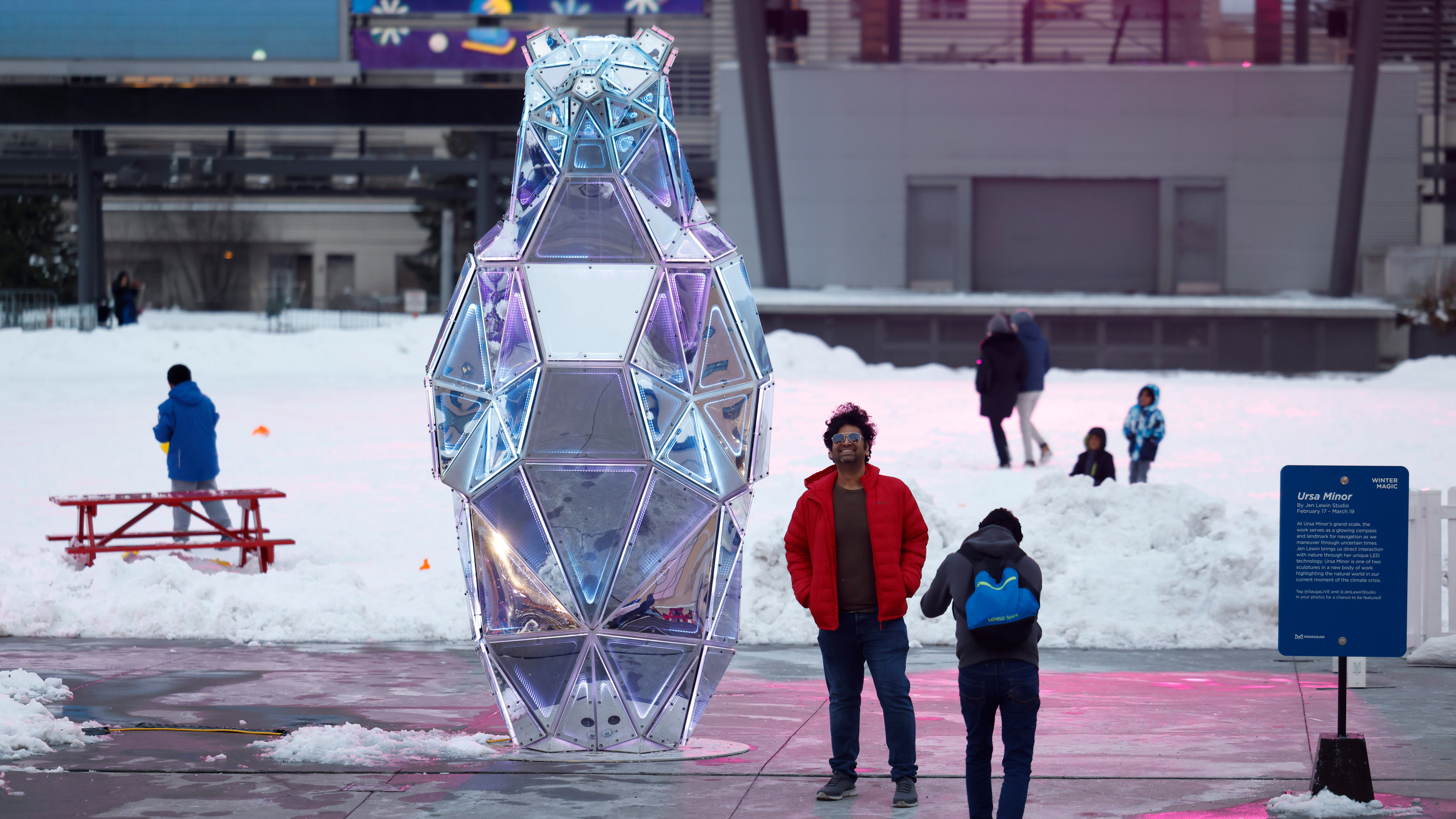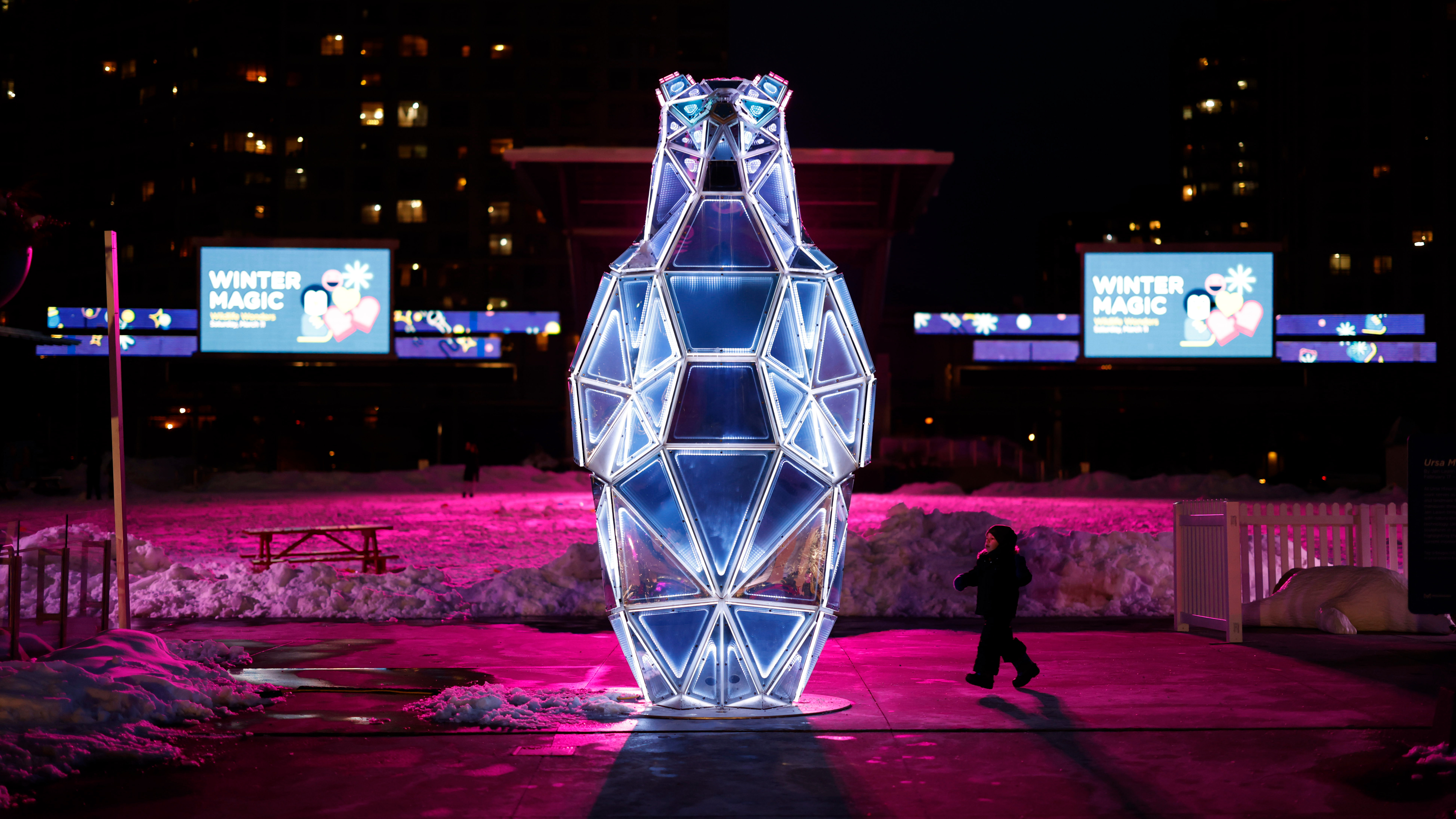 Ursa Minor is a towering 12-foot-tall infinity mirrored bear by American contemporary artist Jen Lewin.The sculpture is free-standing and engages onlookers with its colorful flowing and interactive LED light choreography. Inspired by the dazzling natural phenomena of Polaris (the North Star) and its constellation Ursa Minor, the sculpture’s multi-paneled infinity mirrored body illuminates, conveying emotions of amazement, wonder, and exploration and reminding us to “Look Up”.